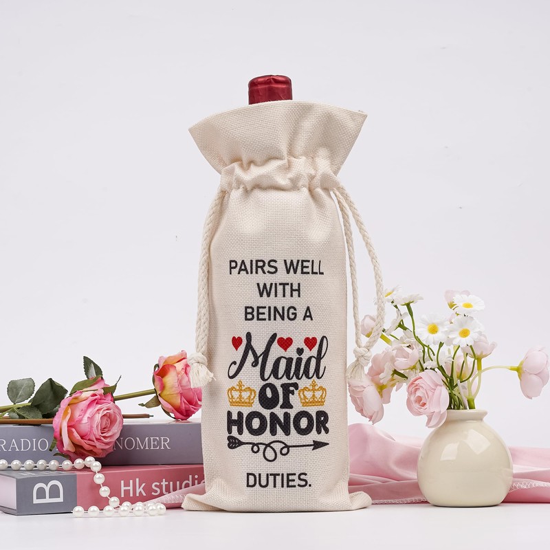Maid of Honor Gifts Wine Bag - Bridesmaid Proposal Present by Drawstring Burlap, Wedding Engagement Bridal Shower Bachelorette Party Favor for Bestie Friend