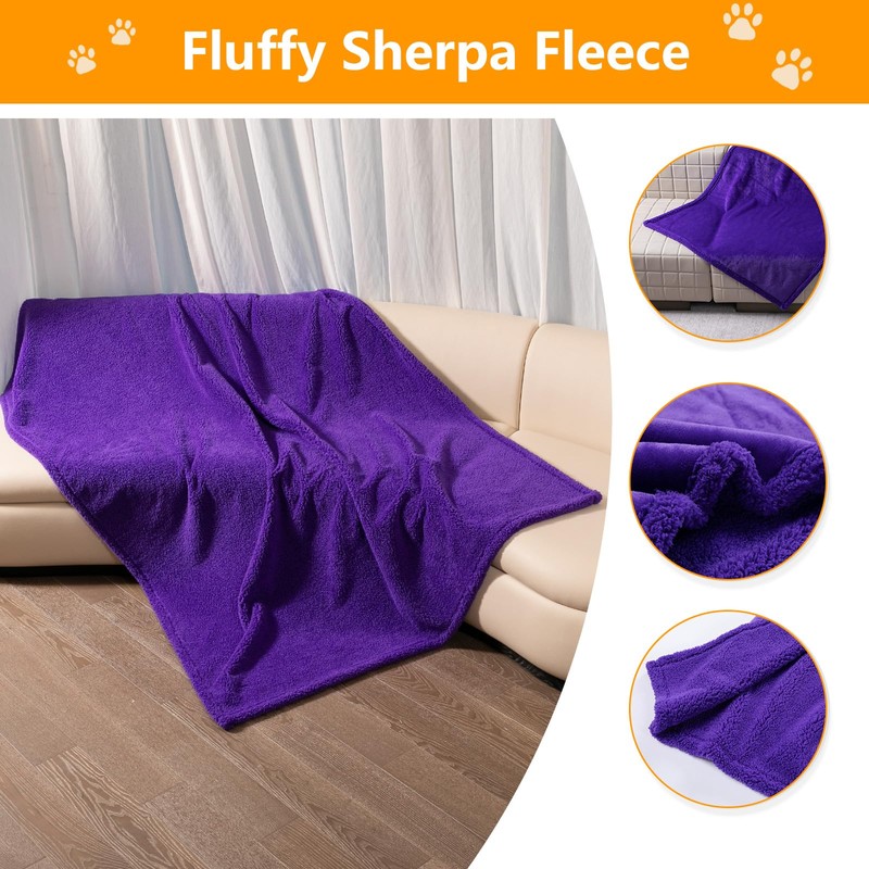 - Waterproof Dog blanket: These blankets are Double-sided designed, one side is made of warm Sherpa, the other side is make of with flannel fleece,Waterproof inner lining,so they can prevent almost all types of moisture and liquids from leaking through. Reversible purple pet blanket for bed cover:Dog blanket is reversible with two different textures and colors.