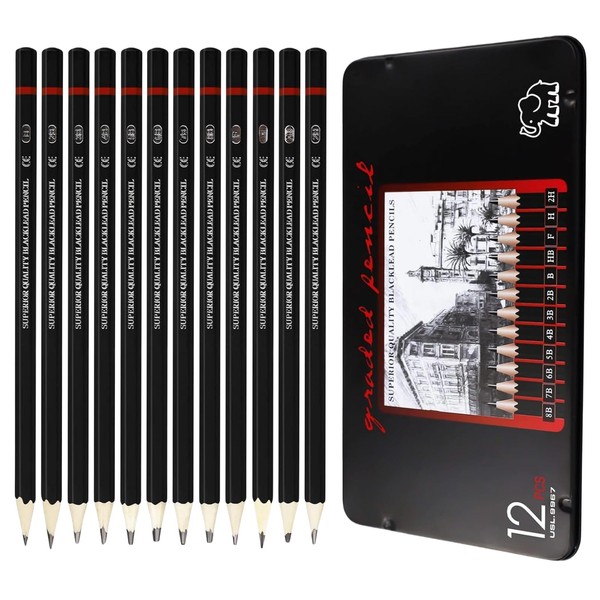 - [Professional Set]:Sketching Pencils Set includes 12 graphite pencils ,8B,7B,6B,5B,4B,3B,2B,B,HB,F,H,2H.Excellent for variation in drawing techniques.Exquisite iron box packaging to protect pencils from damage