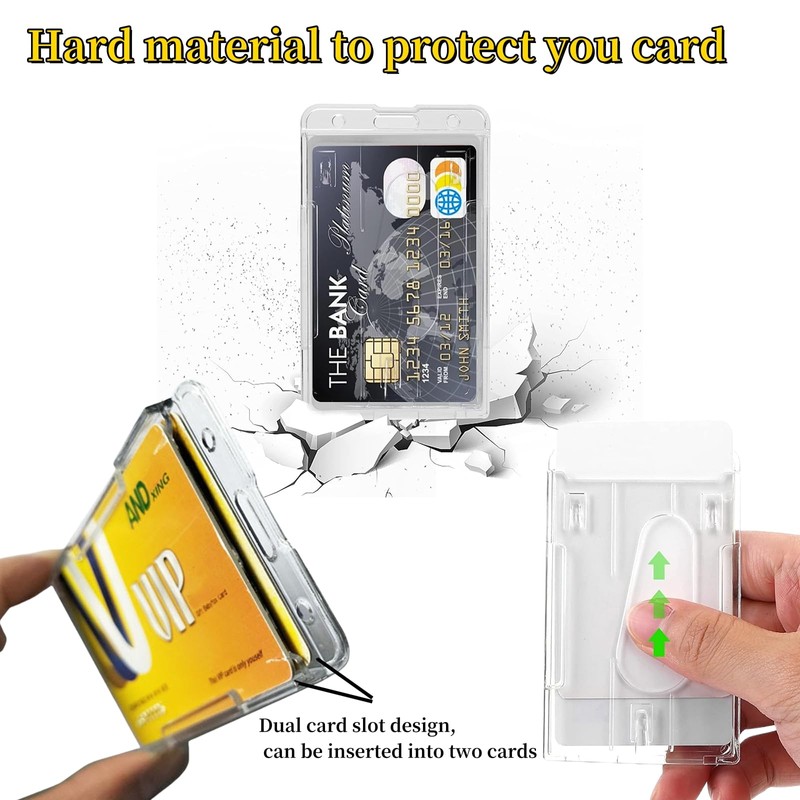 - [Durable Clear Badge Holder]:The card holder is made of polycarbonate, which has high impact resistance, good strength and toughness, and the convenient thumb slot allows you to easily slide the card in/out with just one finger. This badge holder can hold 2 cards, and it has a thumb slot for you to easily take out cards, very convenient for someone who needs to access cards frequently.