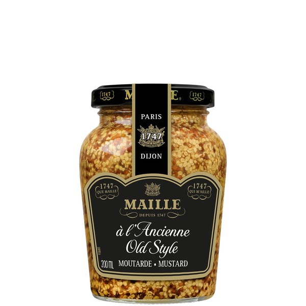 Maille old style whole grain mustard is a delicious condiment reminiscent of an older time. Maille old style whole grain mustard is made with a minimal amount of natural ingredients leaving it free of unnecessary additives or unnatural ingredients. This product is kosher certified. Each jar of maille old style whole grain mustard weighs 7.3 oz. With 42 servings per jar and 5 calories per serving. Refrigerate after opening. See nutrition facts panel for allergens.country of origin : united statesis kosher : yessize : 7.3 ozpack of : 6selling unit : caseingredients : water;mustard seeds;vinegar;salt;white wine;sugar;natural flavor;lactic acidkeywords : calorie;condiment;kosher;low;natural;traditional