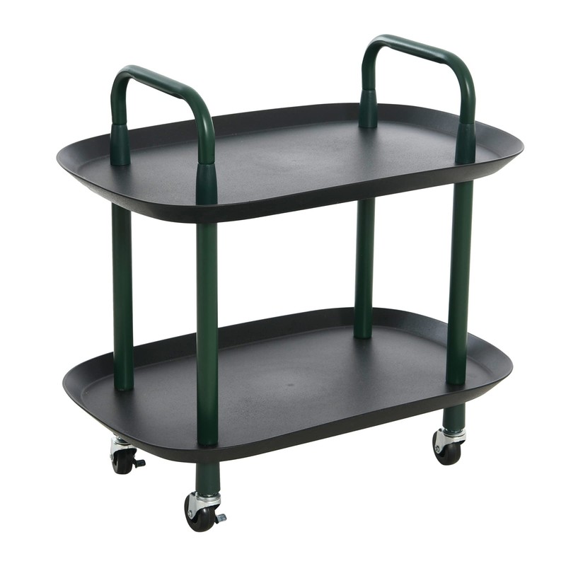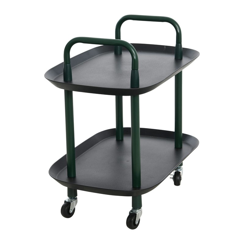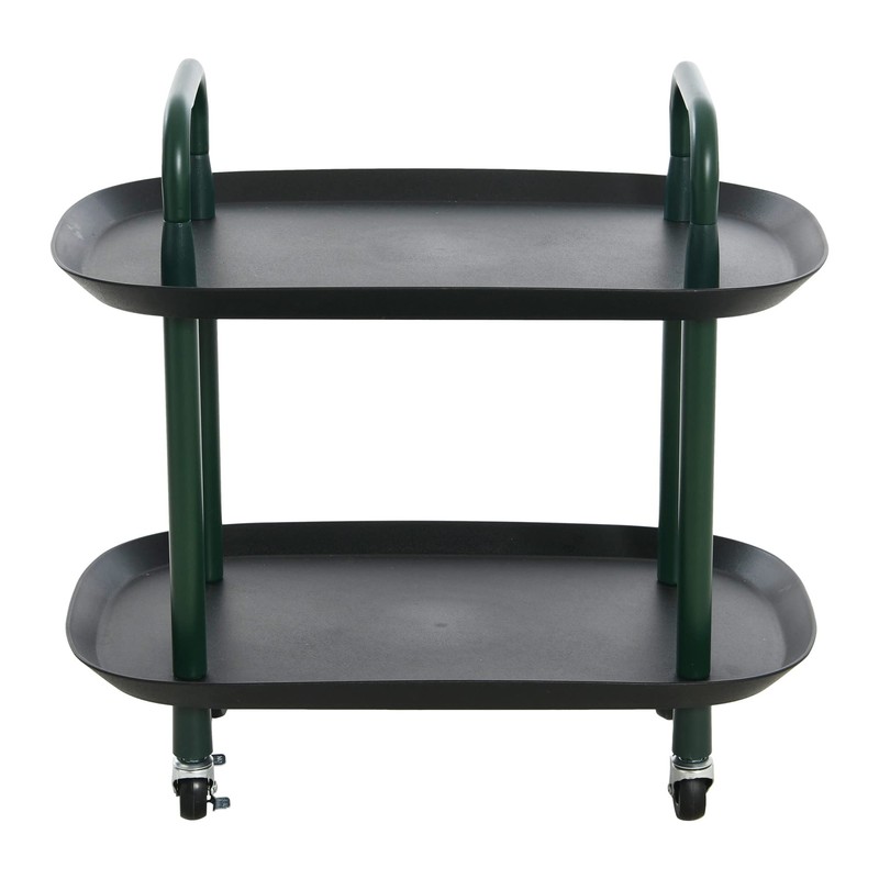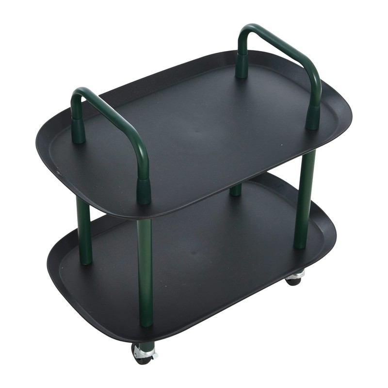 - 2-tier black plastic and dark green steel trolley with a smooth matte finish and 4 locking casters