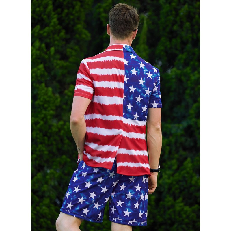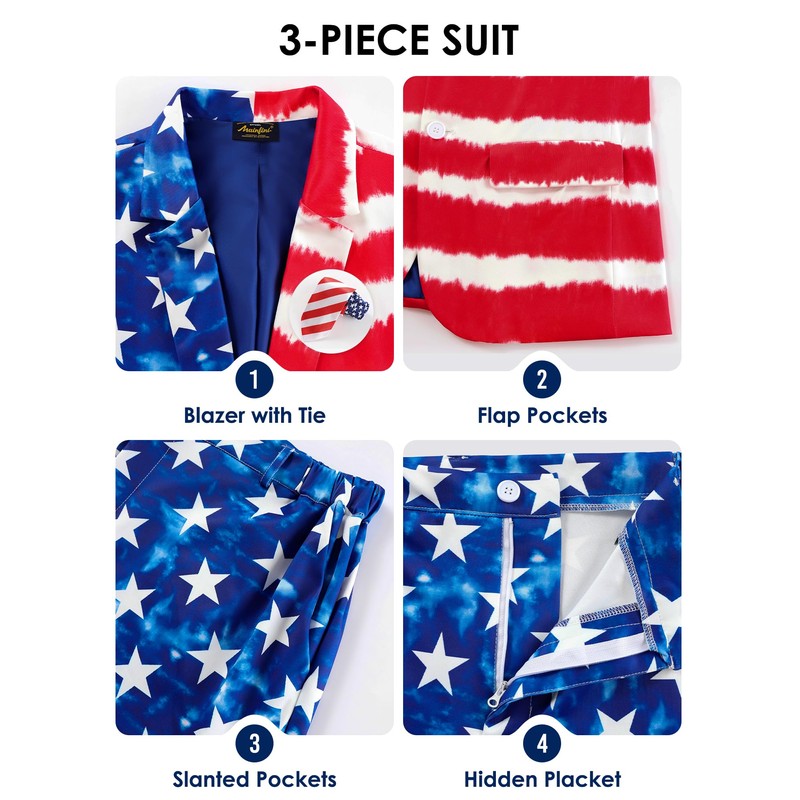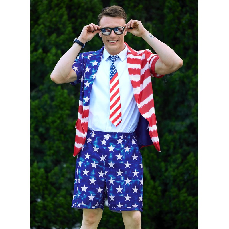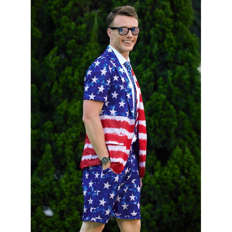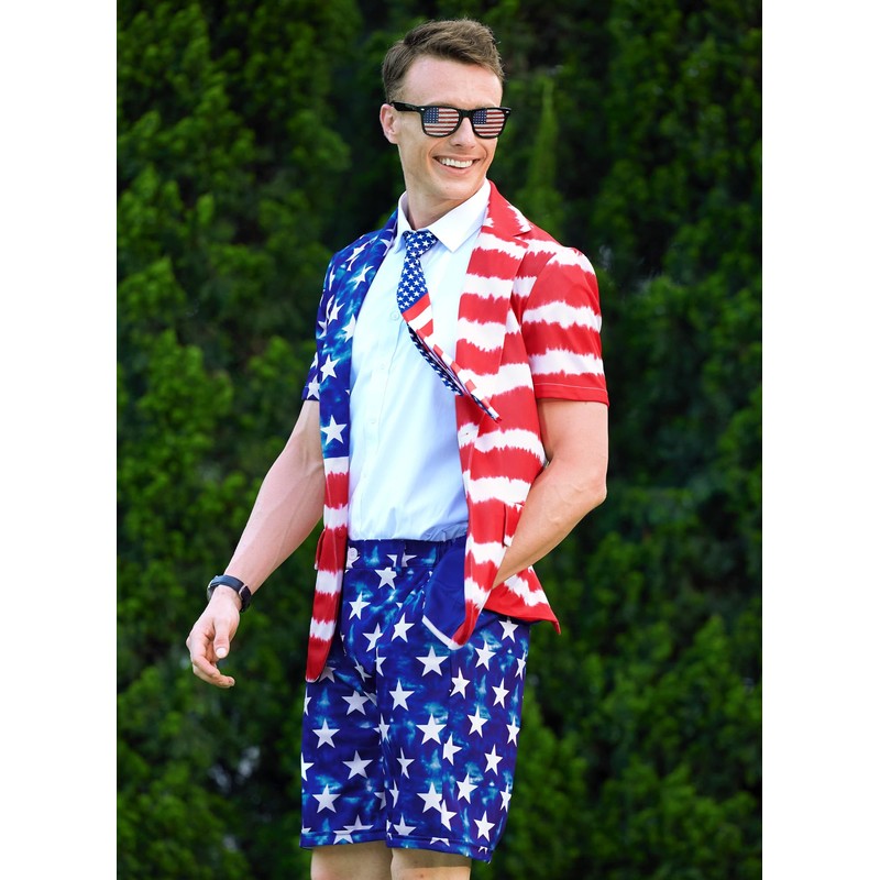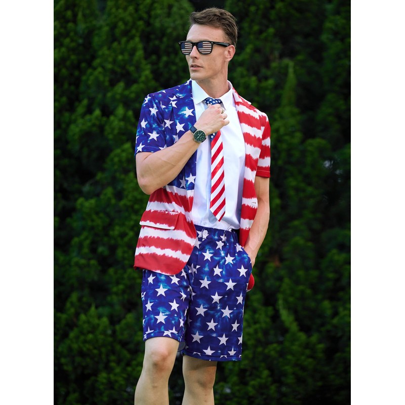- 4TH OF JULY SUIT - Show your patriotism in style with Our Patriotic 2 Piece Suit, featuring classic American Flag design, Stripes and Stars patterns. Come with a Blazer paired with a Tie and Short, must sure to help you stand out in the crowd!