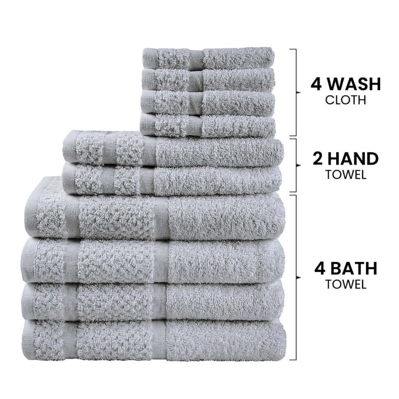 - 10-piece set includes 4 bath towels, 2 hand towels, and 4 washcloths.