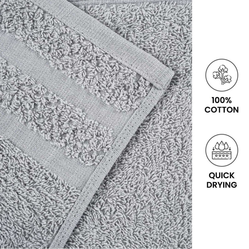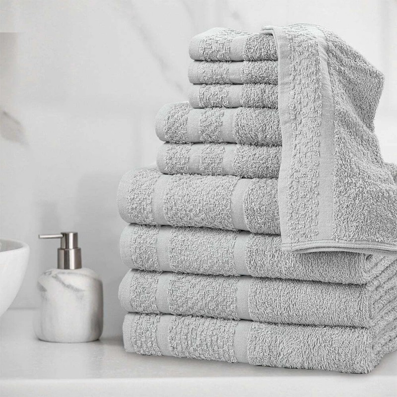 Embrace yourself in the comfort of the Mainstays Value 10-Piece Towel Set. Made from soft, absorbent 100% cotton, these towels dry quickly . The new design features a popcorn textured border for a fresh look in your bathroom, and double needle stitching for durability. This fade-resistant set includes four bath towels, two hand towels, and 4 washcloths, All age group. and all machine washable..
