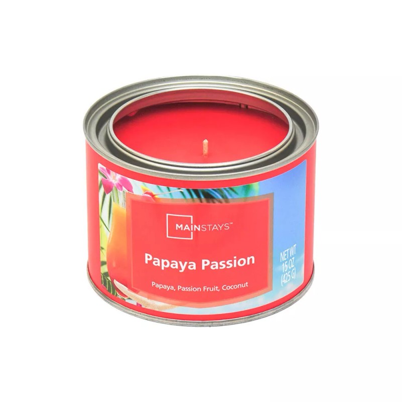 Papaya Passion - This scented paint can candle from Mainstays is a highly fragranced candle that is poured with a premium wax blend that allows for a smooth, consistent burn. The are packaged in a unique, reusable metal tin in a variety of fragrances and colors that will go well with all your current home decor. The candles have a lead-free wick and are poured in the USA.