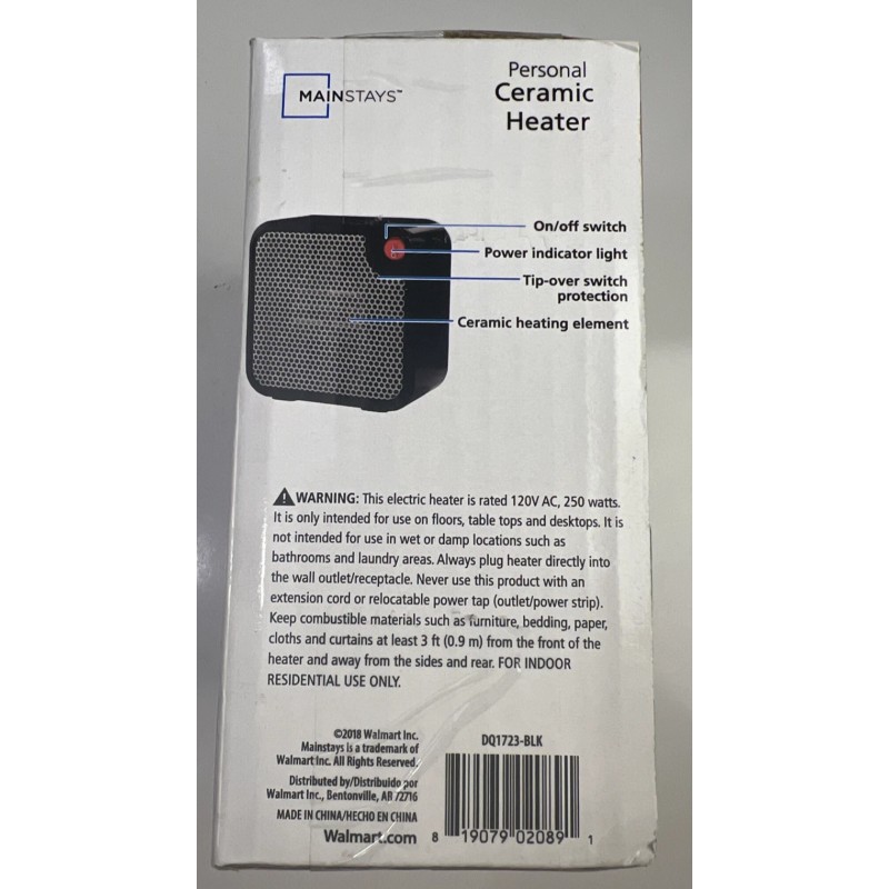 Mainstays Personal Ceramic Heater DQ1723-BLK New Unopened