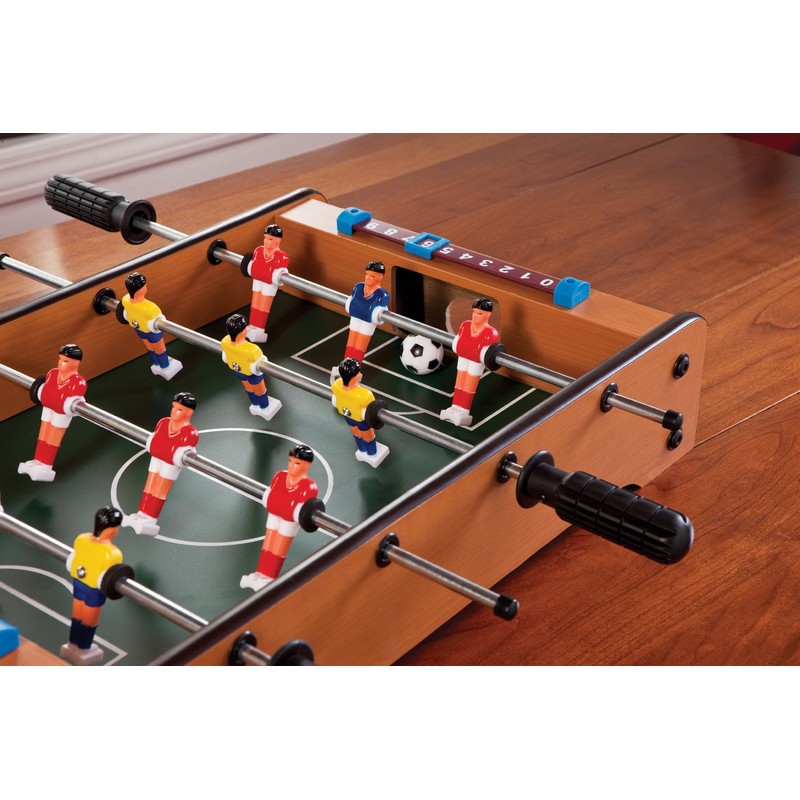 - Includes two "soccer-style" foosball balls, two manual sliders for keeping score, and dual-end ball returns