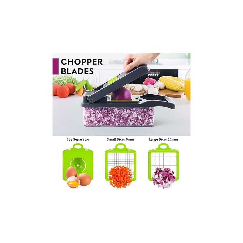 • 【SUPERIOR QUALITY】 - The latest multifunctional vegetable chopper and slicer chop, dice, slice or grate! This vegetable chopper is a practical kitchen tool, the vegetable chopper offers multiple functions in one highly versatile kitchen gadget. The Onion Chopper is made of top quality materials such as high quality stainless steel blades and food grade materials. The vegetable chopper can cut most types of vegetables and fruits.