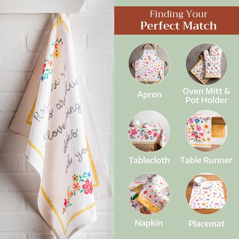 - DECORATIVE AND FUNCTIONAL These kitchen towels are a fun addition and practical for cleaning cutlery, plates, pots or cleaning surfaces. The Happy Florals Sweety kitchen towel set brings out the true beauty of nature in its simplest form with a beautiful arrangement of flowers and butterflies. These towels come in a clean color palette of yellow and beige, are decorated with colorful butterflies and a variety of flowers.