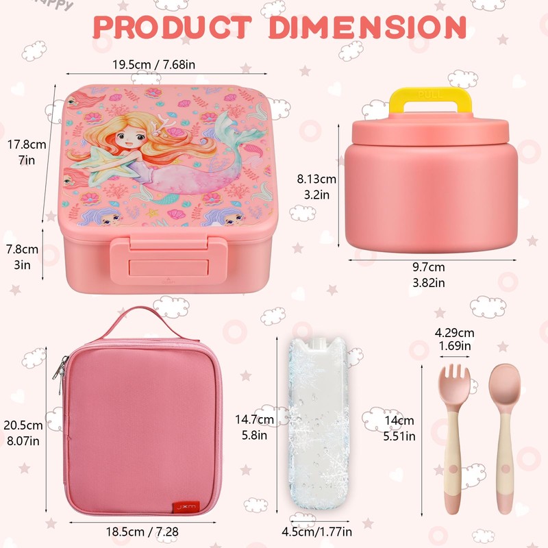 MAISON HUIS Kids Bento Lunch Box Set With 8oz Soup Thermo, Leakproof Lunch Containers with 5 Compartment, Thermo Hot Food Jar and Insulated Lunch Bag, BPA Free,Travel, School -Pink (Mermaid)