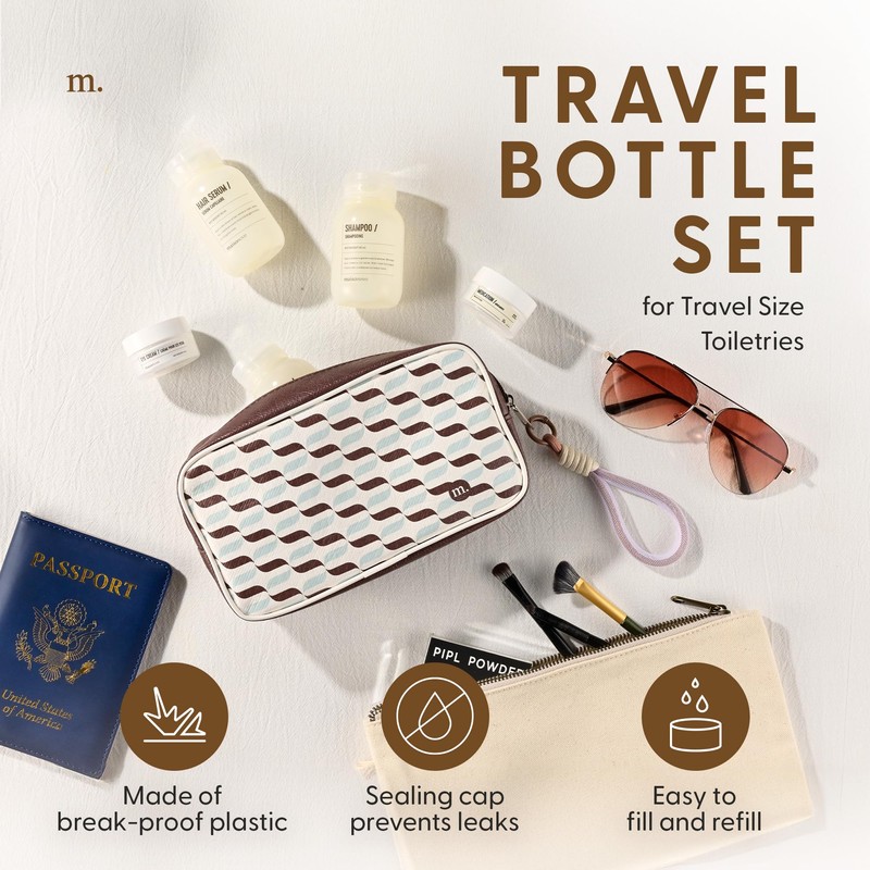 - This Travel Essentials Toiletries Includes: 1 Brown Travel Pouch, 4 80ml Clear Travel Bottles, 4 15ml Clear/White Travel Jars, 1 Set of Transparent/White Label for Bottles, 1 Set of Transparent/White Label for Jars, 1 Set of Cute Sticker Silver/Gold. Travel toiletry bottles Can be sold as a set with MaisoNovo Countertop small travel containers tray for bathroom counter and soap tray for kitchen sink.