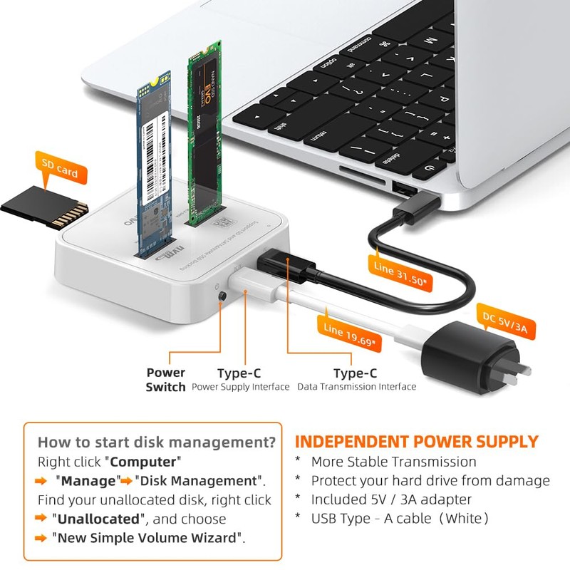 - 【Compatibility】This dual bay M.2 SSD dockcase can simultaneous read and write M.2 NVME PCIe and NGFF SATA SSDs in size 2230/2242/2260/2280/22110mm. And it supports reading standard SD/SD Express 7.0/7.1 Card.【DO NOT SUPPORT CLONE】