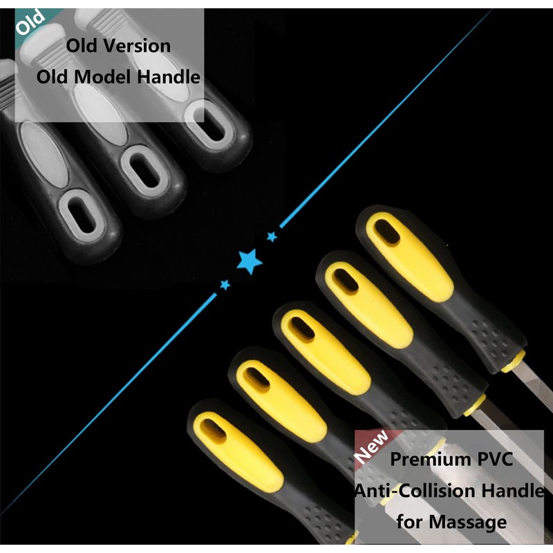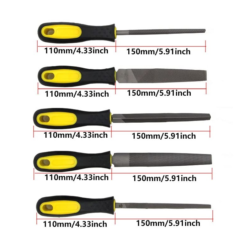 This product is a five-piece file set, which contains 6-inch files of various shapes, including round/semi-round/square/flat/triangular files.
