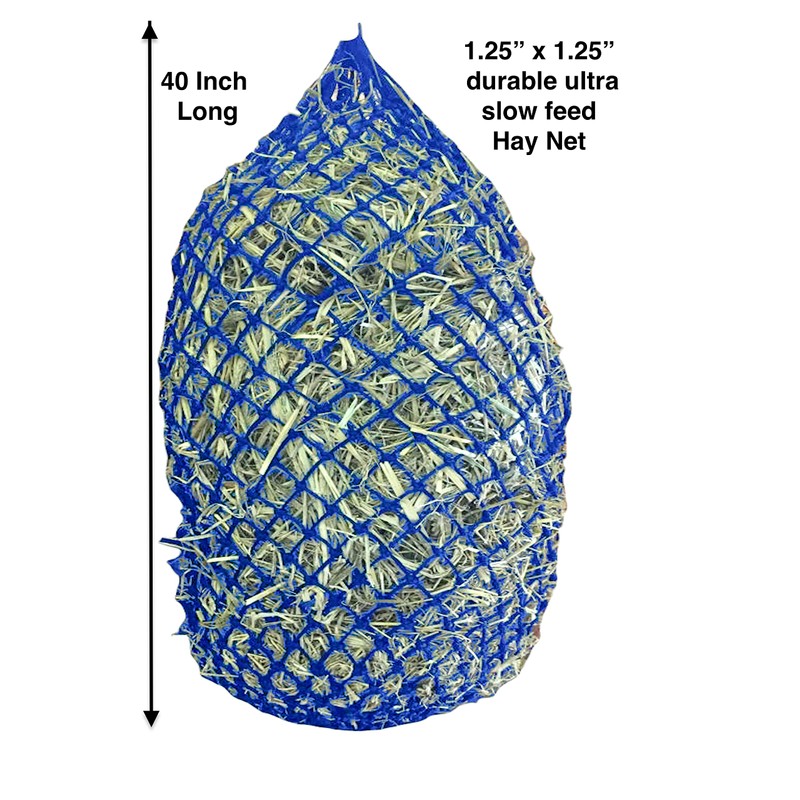 Majestic Ally 1.25”x1.25” Holes Ultra Slow Feed 38” Very Sturdy Hay Net with Bottom Ring for Horses, Nylon monofilament Rope Hanging, Travel Feeder for Trailer and Stall, Reduces Waste (Royal Blue)