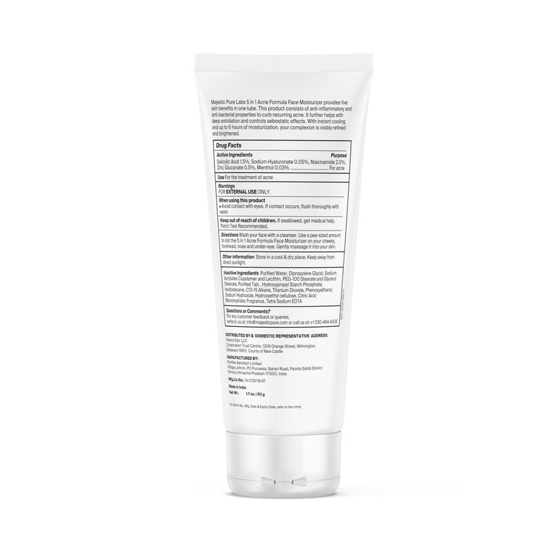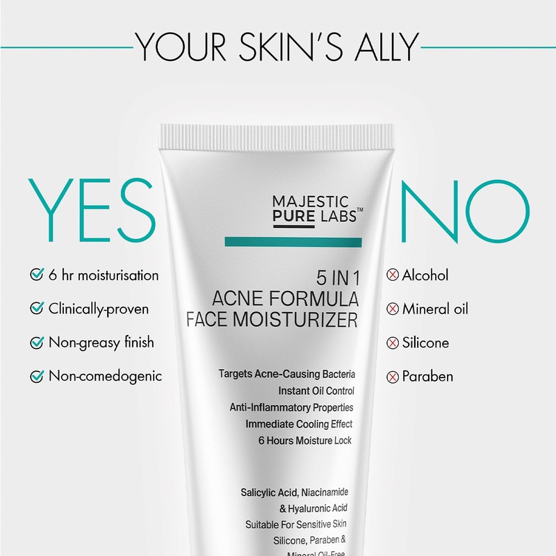 - Effective Acne Control: 5 in 1 Acne Formula Face Moisturizer is effective against all possible acne targets. It is antibacterial and has a sebostatic effect that suppresses excess sebum production. It is composed of Salicylic Acid to address acne by reducing swelling and unclogging pores