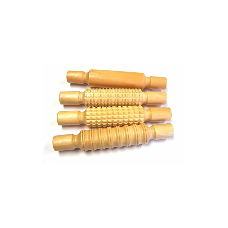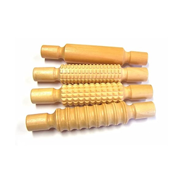 - Set of 4 wooden rolling pins with 4 different surfaces – 3 patterned and 1 smooth