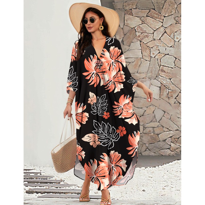 - Sexy flying design: The summer beach kaftan dress under consideration features a deep V-neckline and flattering batwing sleeves; its perfect length drapes beautifully, making the wearer look tall, slim and effortlessly sensual