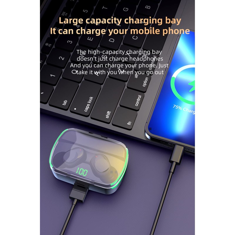 - Indicador de potencia LED integrado en la caja de carga. Cuando la caja de carga se está cargando, la luz LED parpadeará de 1 a 100, por lo que no hay necesidad de cargar en cualquier momento cuando la potencia es baja. Cuando los auriculares de tapón se cargan en el estuche de carga, la luz LED de los auriculares de tapón será de color rojo brillante y se apagcuando estén completamente cargados. Los dos lados de la carcasa están equipados con una iluminación super cool para el entorno de juego, que te ofrece un ambiente diferente.