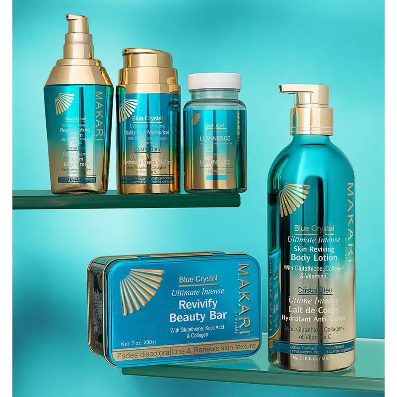 For years, women of color have sought high-end skincare products designed exclusively for their unique concerns. Finally, with the Blue Crystal collection by Makari, everyone can achieve the clear, smooth, glowing complexion they’ve always dreamed of. Specially formulated for all skin types, our rejuvenating Reviving Body Lotion is enriched with Glutathione, a naturally derived active whitening agent. Regularly apply lotion all over skin, and watch as dark spots, acne blemishes, scars, and hyperpigmentation fade away for a fresh, youthful, perfectly even appearance. Infused with antioxidant-rich herbs, it also smooths uneven texture and tightens saggy skin for maximum anti-aging effects. Use daily with Makari’s complete line of Blue Crystal lightening products to achieve your ideal shade of beautiful.