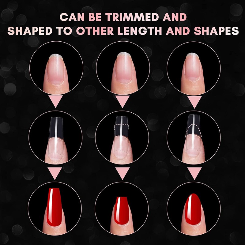 - U-Shaped Design French Nail Tips- These strong fake nails are in clear and half cover shape with moderate length and thickness, like Letter "U". You can wear these press on nail tips long or clip them short, or design your own style and pattern . Easy to shape, file, paint and apply with nail gel, acrylic powder or poly nail gel, making your nail tips magical and stylish.