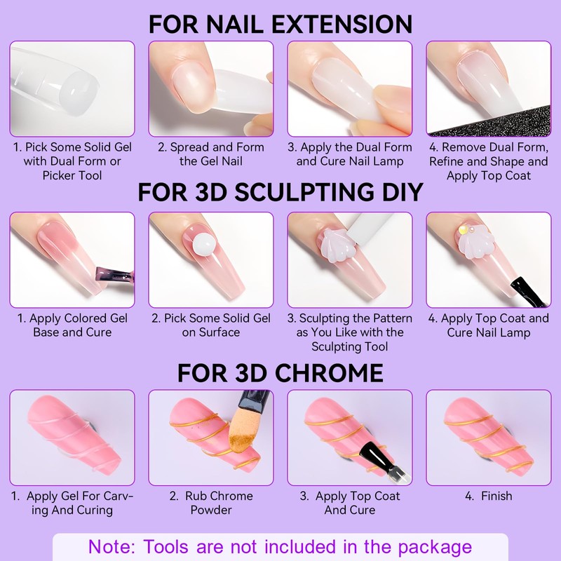 - Easy to Apply and Beginner Friendly- This carving gel for nails is simple to use. The solid texture makes it nonstick-to-hand and easy to manipulate,quick to build the gel nails without sticking to your hands or nail art tools. No mess, no residue. No need for slip solution, monomer liquid, nail forms for acrylic nail kit. It needs to be cured for 60-120s via UV/LED nail lamp