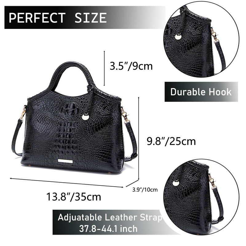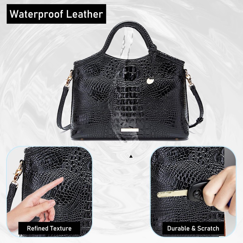 - High Quality Material: This handbag is made of high-quality, water-resistant, and scratch-resistant faux leather with a crocodile print. The shiny and textured exterior, along with the gold zippers and sturdy hardware, adds to its durability and stylish appeal. The soft and comfortable lining ensures the protection of your belongings