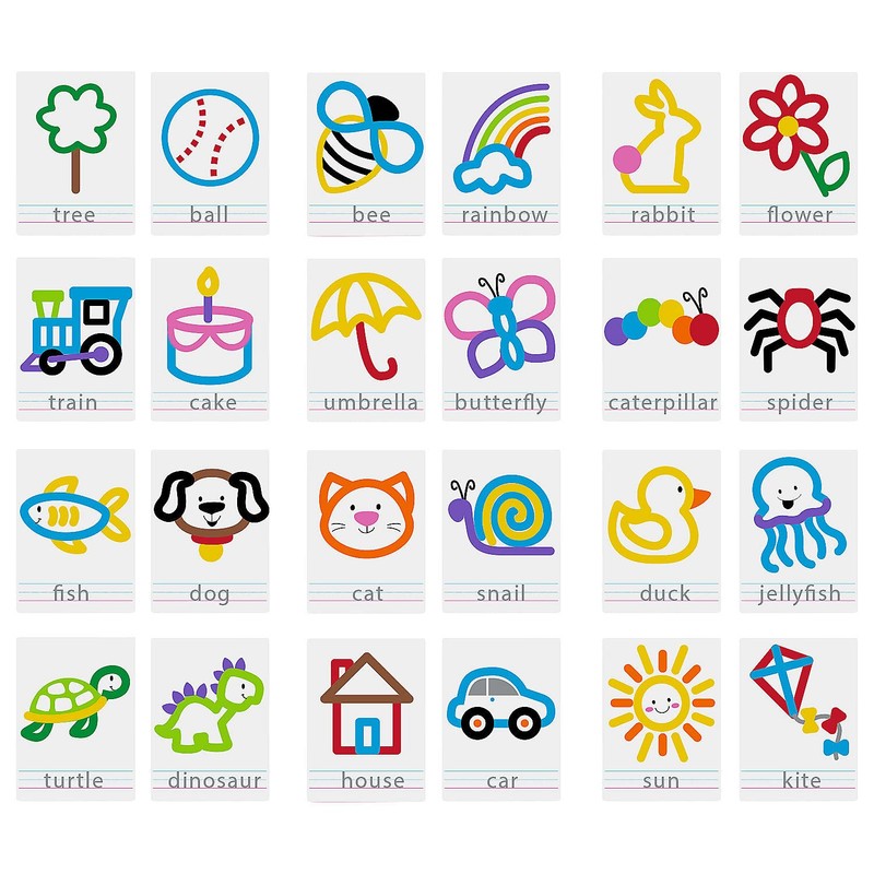 - There’s so much learning to be had with these educational resources! Each dry erase card features a different everyday object, such as a tree, rabbit or flower to serve as a teaching aid. Kids can use their own dough (sold separately) to make each shape, using the pictures as reference. They can also use dry erase markers (sold separately) to write the object’s name in the space underneath the image, following the dotted lines to guide their writing. Teachers and caregivers can reference these c