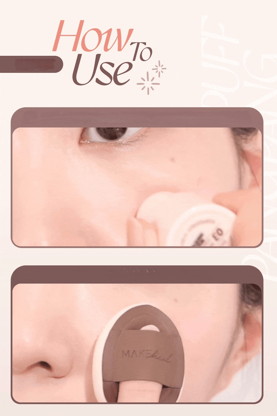 1. Tap the product on desired areas. 2. Apply the product on mini pang pang puff to blend. 3. Complete bright and lively makeup.