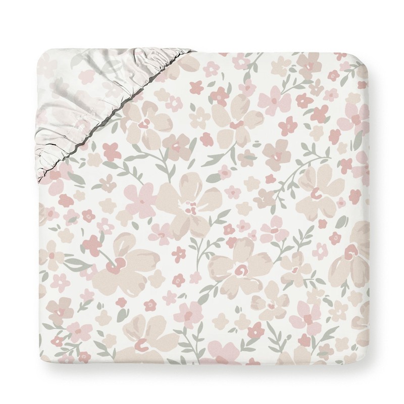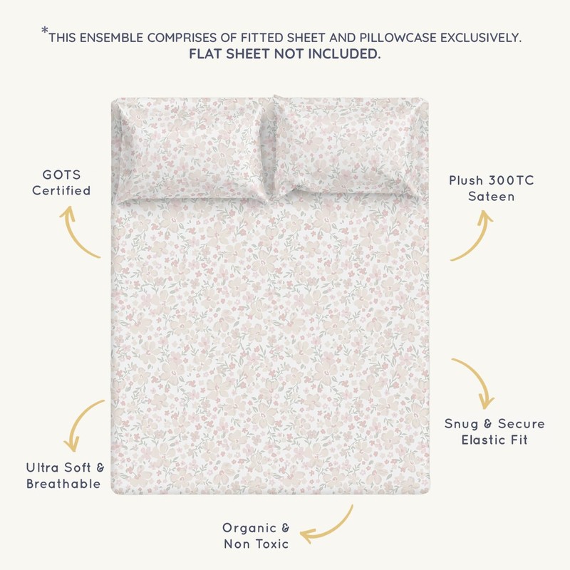 MakeMake Organics Organic Queen Fitted Sheet Set GOTS Certified Organic Cotton Fitted Sheet with Pillowcase Ultra Soft Non Toxic Breathable Flowers Peach Pink Girls Room (Queen, Blossom)