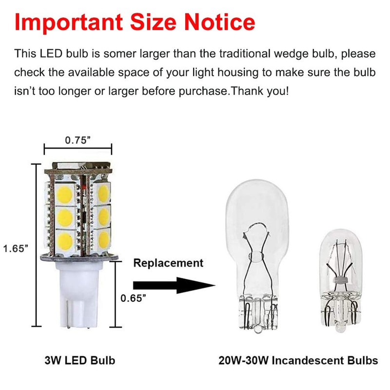 **Important Note:** This LED bulb could not compatible with electronic transformer in under cabinet lighting, which might cause flicker. Please kindly check before purchasing. **Tips:** these LEDs are taller and larger than the incandescent bulbs they replace. Make sure they will fit into your fixture. Please check the measurement on the picture. For landscape lighting, the LED bulb is used to replace the T3-1/4 T5 T10 921 912 904 194 miniature wedge bulbs. For automotive RV lighting, the LED bulb is used for T10 wedge bulbs replacement and for dome lights only,NOT for the automotive T5 Instrument Cluster Gauge Dashboard Indicator lamps and headlights. The base is miniature wedge base. **Parameters** Wattage: 3Watts Lumen output: 300lm Warm white 2700-3000K Color Rendering Index: 82 Low voltage working system: AC10-18V/DC12-30V, Works on 12AC/DC Base type: Miniature Wedge Dimmable: No Dimensions: 0.75"(W) x 1.65"(L) Working temperature: -35 to +55°C Long lifespan: Over 35,000 hours(Note: the enclosed fixture would shorten the life span of LED bulbs) Wide applications: landscape Lighting pathway lighting fixtures, step lights and automotive RV lighting. Cross Reference: T3-1/4 T5 T10 921 912 904 194