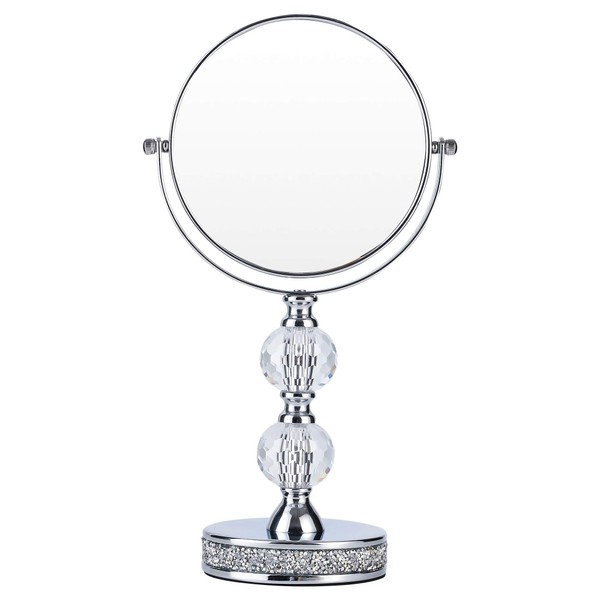 - 【Crystal + Metal Design Cosmetic Mirror】 This makeup mirror is made of stainless chrome metal, it is designed with shiny crystal elements,the base decorated with rhinestones, these make the mirror looks more classic and beautiful