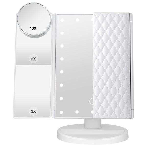 DenCert Makeup Mirror Vanity Mirror with Lights 1X 2X 3X 10X Magnification, Lighted Makeup Mirror, Touch Control, Tri-Fold Portable LED Makeup Vanity, Two Power Supply Modes, White