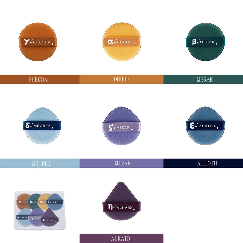 The powder puff designed by Big Dipper: it is made of high-resilience cotton super-dense fine-pore material, which is not easy to absorb powder. The widened ribbon design makes your makeup more convenient and firm. Each powder puff ribbon has a planet name on it.The puff can be used on both sides.
