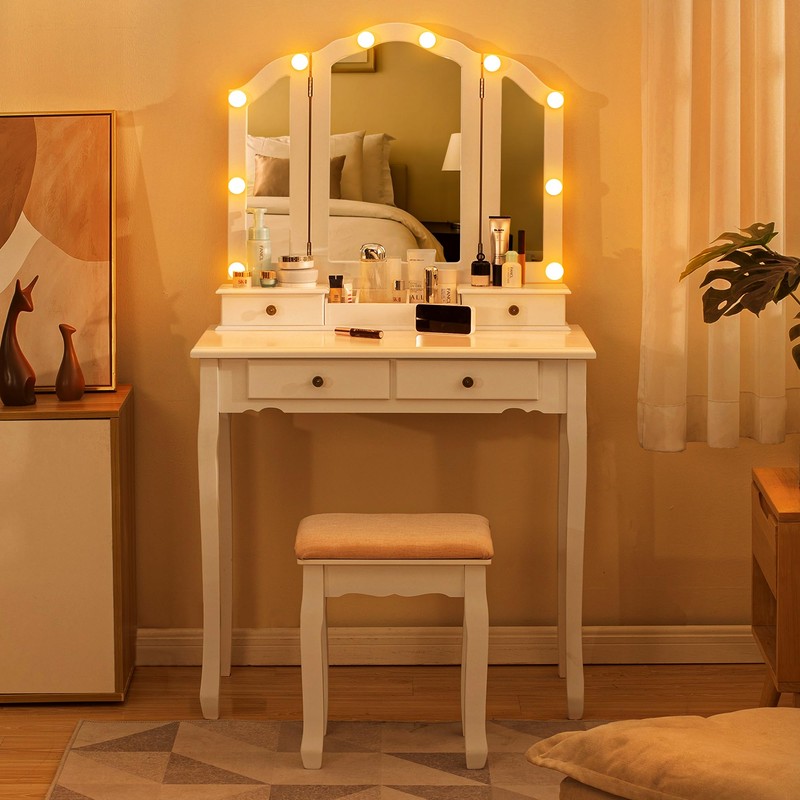 Makeup Vanity Desk with Lighted Mirror, Tri-Fold Vanity Table with 3 Adjustable Lights, 4 Drawers, 2 Open Compartments, Upholstered Stool Included, White