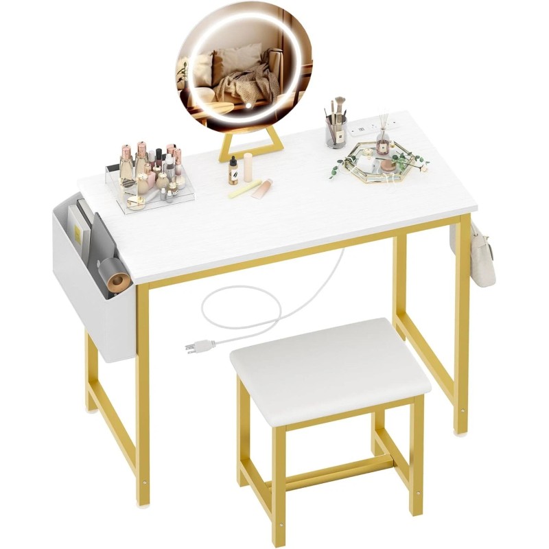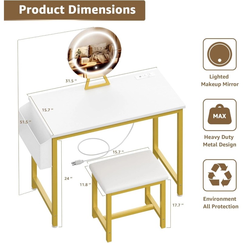 Makeup Vanity Desk with Mirror and Lights White Gold Dressing Table with Stool