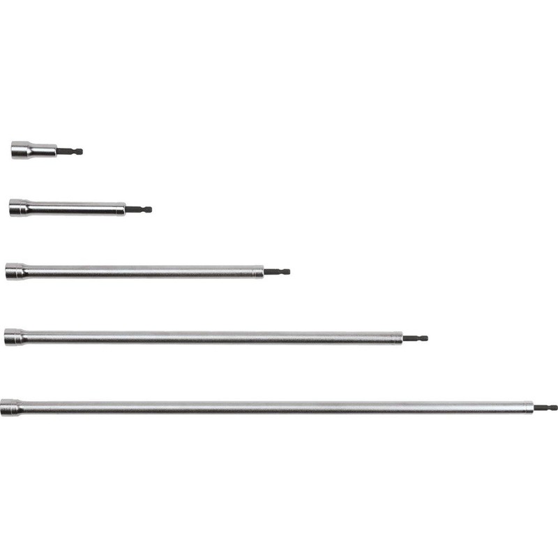 The Makita Hollow Sockets are designed to accelerate overhead fastening work by reducing time-spent hand threading fasteners over threaded rod. The hollow shafts allow long bolts and threaded rod to pass through in fastening applications while the increased socket lengths provide better access to nuts located in high places in ceiling or ductwork. The 1/4" hex shank is press-fit for durability and drops readily into an impact driver or driver-drill for convenient, automated fastening.