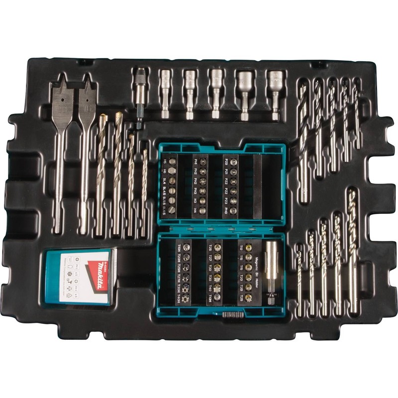 Get one convenient set of bits and sockets for drilling, driving and fastening in one convenient carrying case with the Makita 69-Piece metric drill and screw bit set (B-49638). the set includes bits for drilling into metal, wood and masonry materials as well as insert bits for fastening applications. Fastening applications are covered with an assortment of Phillips, Pozidriv®, Torx®, security Torx®, slotted and hex insert bits. The set also includes grounded high-speed steel (hss-g) metal and wood drilling bits, Spade bits, brad point wood drill bits, and masonry hammer drill bits with straight shank for use with most 3/8” and ½” drills. The kit also includes ¼” hex Nutdrivers, ¼” hex quick-change big holder, and a ¼” hex magnetic bit holder. The convenient interlocking case is compatible with Makita interlocking cases and cart.
