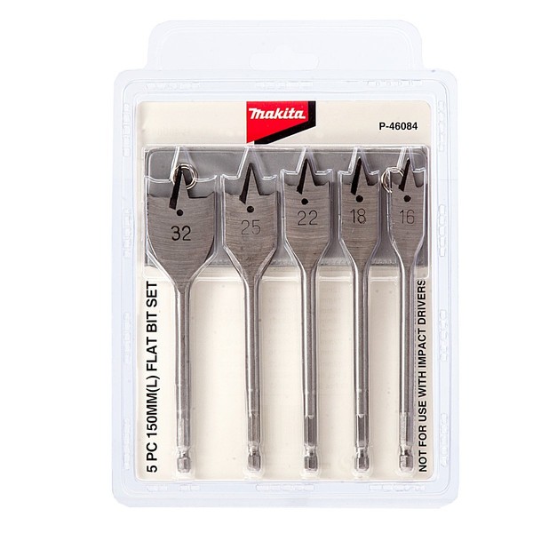 MAKITA P-46084 Hex Shank Wood Flat Drill Bit Set 5pc - Includes Sizes of - 16mm 18mm 22mm 25mm 35mm Makita Hexagon 150mm Standard Wood Flat Bit Set 5 Piece Features: Precision ground Hex Shank drill bits perfect for Woodworking tasks Hex Shank Drill Bit Diameters:16mm,18mm, 22mm,25mm and 32mm Hex Shank Drill Bit Length:150mm