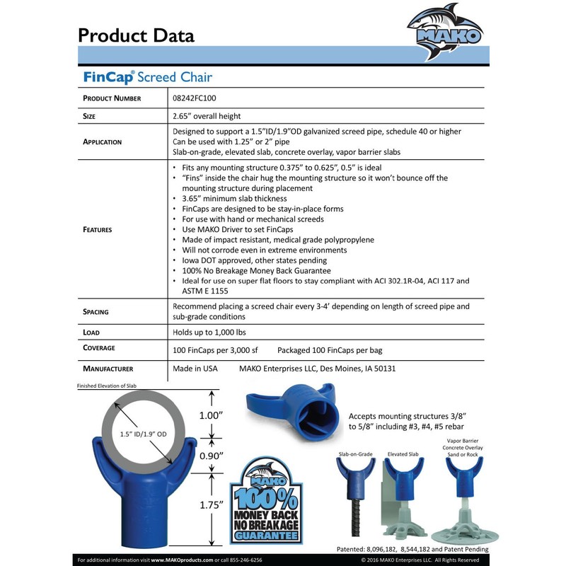 - The “fins” inside the screed chair hugs rebar, threaded rod, conduit, metal stakes, or PVC pipe from 3/8" (10mm) to 5/8" (16mm.) The FinCap holds up to 1,000 lbs making it the most versatile screed support available.
