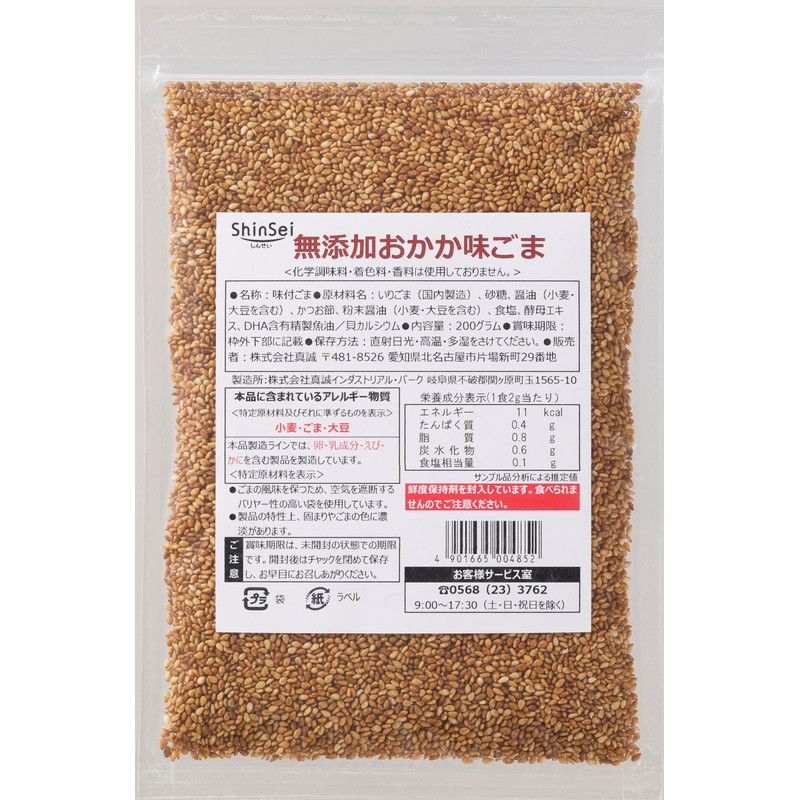 - Sweet sesame (made in Japan), sugar, soy sauce (includes wheat and soy), bonito knots, powdered oil (including wheat and soy), salt, yeast extract, refined fish soy with DHA / shell calcium