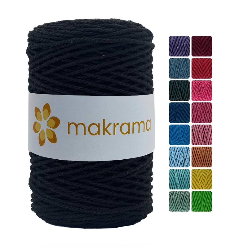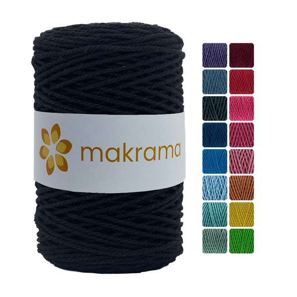 MAKRAMA Cuerda de Algodón 2mm Macramé 200 Metros 500gr Colores (Negro)