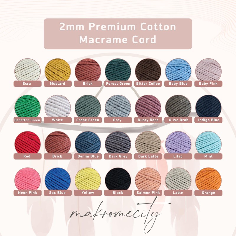 - Cotton macrame yarn - made of cotton. 2mm diameter cord/rope The weight of each spool of cotton macrame yarn is 250 g. Each roll has a length of 590 feet / 180 metres (195 yards); it is enough to perform perfect macrame projects.