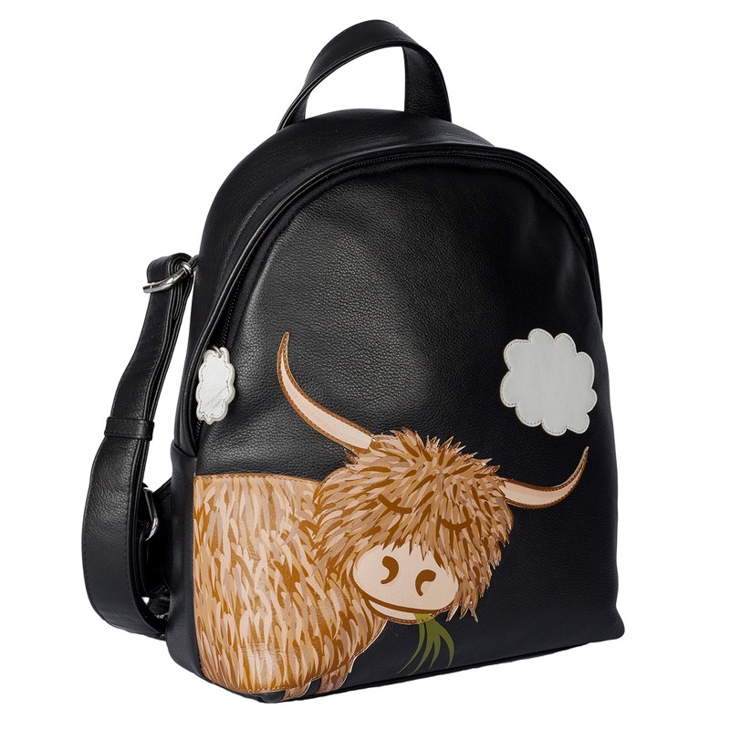 - A fashion style back pack with the Bella Highland Cow to the front and a small version to the back. Adjustable backpack straps for comfort wearing.