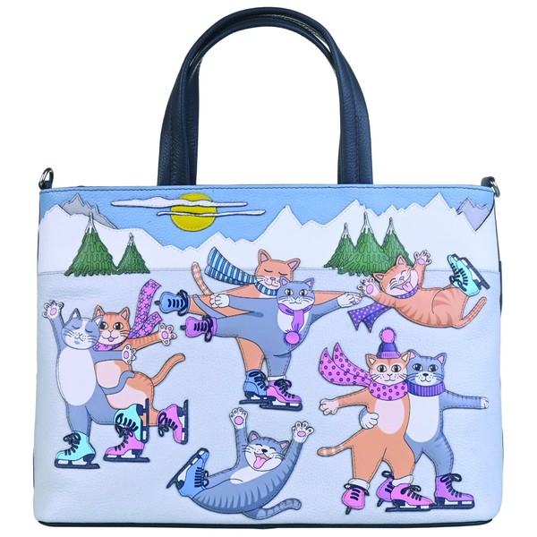 - Soft supple leather grab bag, adjustable detachable shoulder strap with applique 'skating cats' design 31cm x 23cm x 8cm.