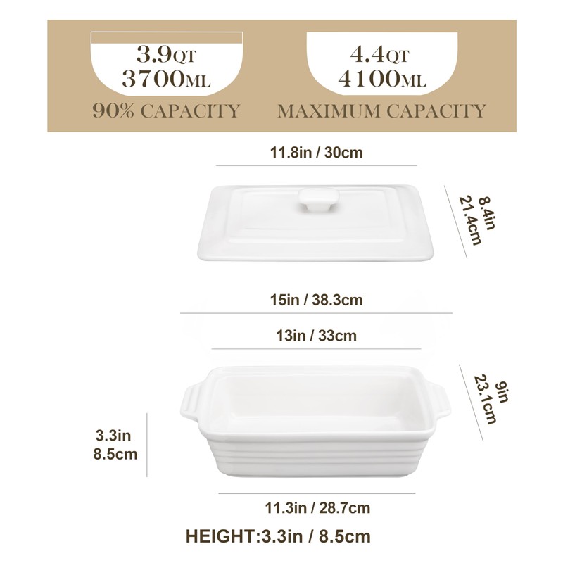 - 【SAFETY UNDER HIGH TEMPERATURE】This 4.4-quart size, 13 x 9 inches, large casserole is made of high quality ceramic, oven safe up to 428°F. It can be used in the oven, microwave, refrigerator and dishwasher. NOTE: No direct fire and induction cooker.