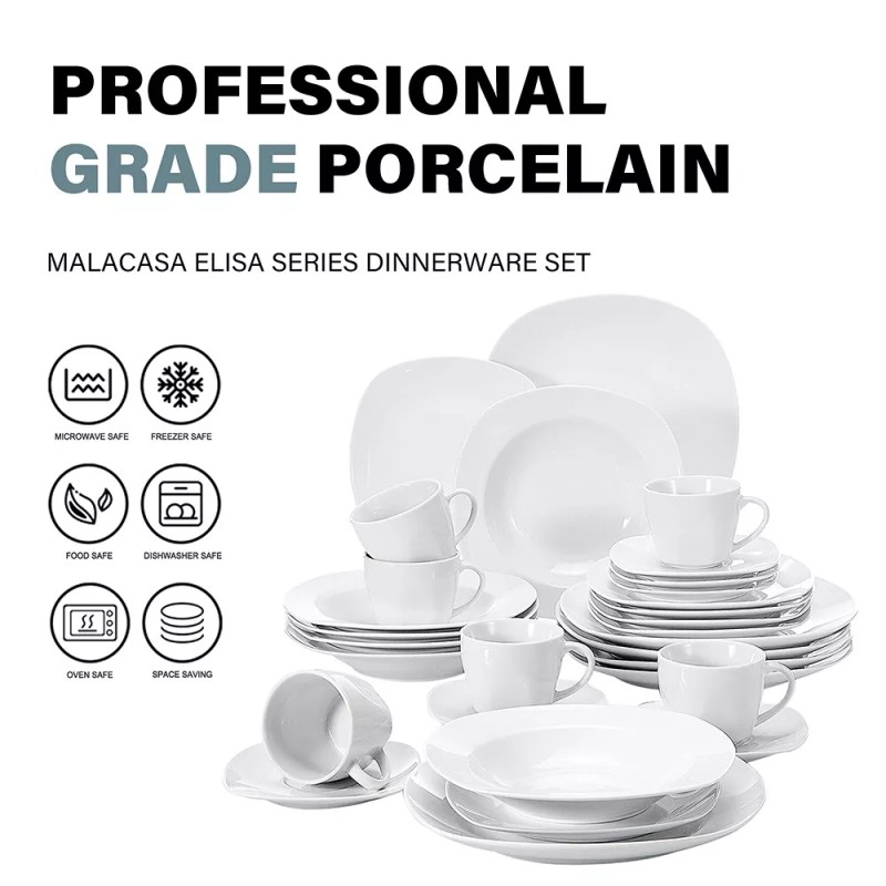 MALACASA Elisa 30-Piece Dinnerware Set Porcelain Plates Bowls Cups Saucers for 6