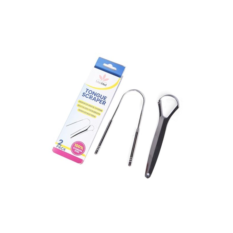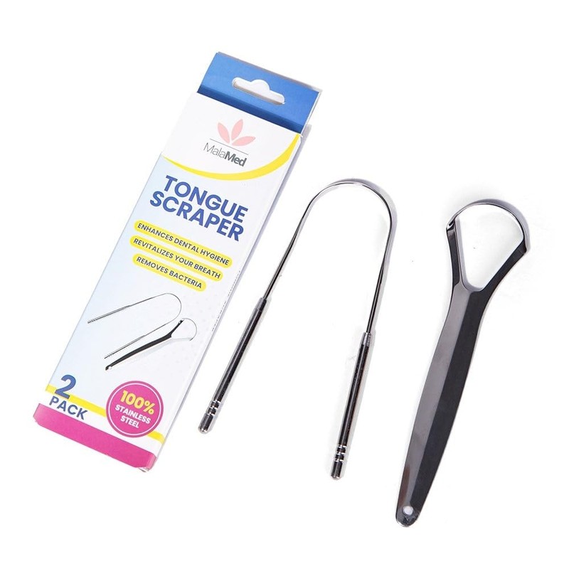 MalaMed | 2 Stück Zungenschaber, 1 x U-Form & 1 x Y-förmiger Metallschaber aus 100% Edelstahl, für Mundhygiene und frischen Atem | Einfach zu bedienender Reiniger für Erwachsene