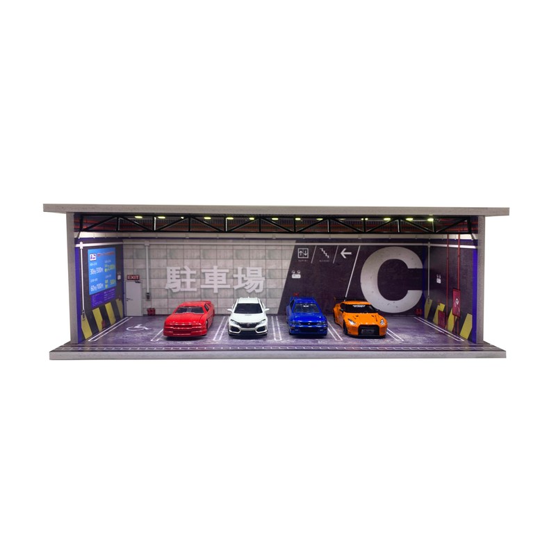Malamfans - Caja expositora de 1/64 para ruedas calientes, estilo japonés, modelo fundido a escala 1/64, con luces LED y tapa acrílica, 6 plazas de estacionamiento