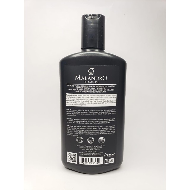 - Malandro Shampoo para hombre está formulado con Colágeno, Extracto de Bergamota, Extractos de Romero, Extracto de Linaza y Extracto de Epilobium, en conjunto contribuyen a fortalecer e hidratar el cabello, brindándole brillo y suavidad.